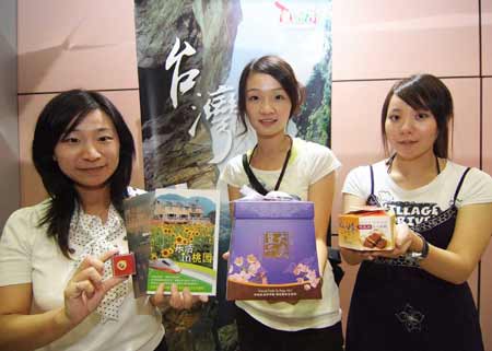 大陆观光首发团四日抵台,桃园县也前往桃园机场宣传桃园之美,其中包括宣传大溪豆干、龙潭贡糖、慈湖观光导览。“中央社”图