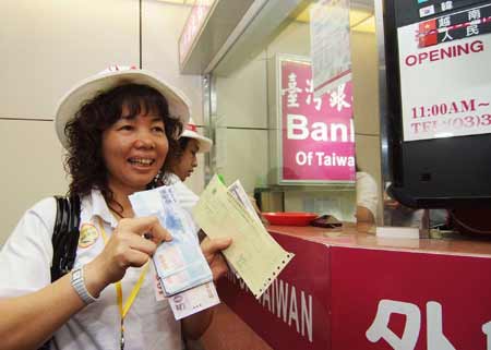 大陆观光首发团四日来台,广东旅客拿人民币兑换新台币时,心情相当兴奋。“中央社”图