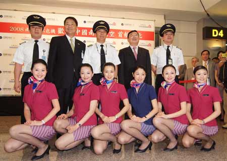 两岸周末包机启动,大陆居民赴台观光首发团四日上午在南方航空抵台后,揭开历史序幕,机组人员在机场留下难得画面。 “中央社”图