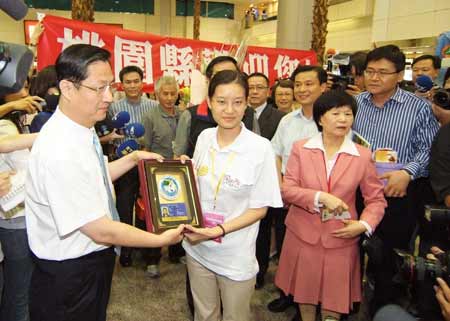 两岸周末包机启动,大陆居民赴台观光首发团四日抵台,搭乘南方航空的香港城市大学的博士研究生陈婷婷(左二),经过计算机选号,成为首发团来台第一人。 “中央社”图