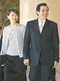 马英九(右)偕夫人周美青出席郭台铭与曾馨莹订婚宴。 台湾联合报图