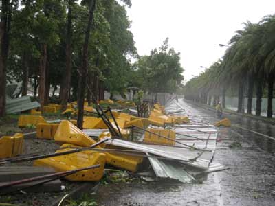 高雄市客家文化园区新建工程不堪强风吹袭,铁皮围篱一路倒塌,严重影响车道的畅通。