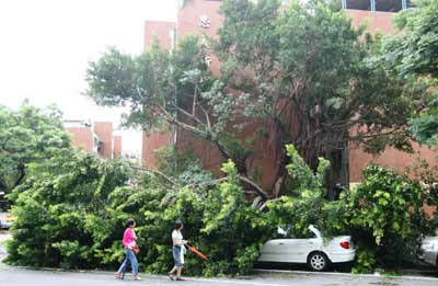 “凤凰”28日侵袭台湾,台北市忠诚路一段一颗路树中午遭强风吹断,挡住了人行道,路过民众只好绕道而行。