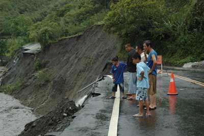 宜兰省道台七线近90公里处,28日因附近兰阳溪水位暴涨,将当地近120公尺的路面冲刷阻断交通,有民众冒生命危险,带小孩一起观看受损情况。