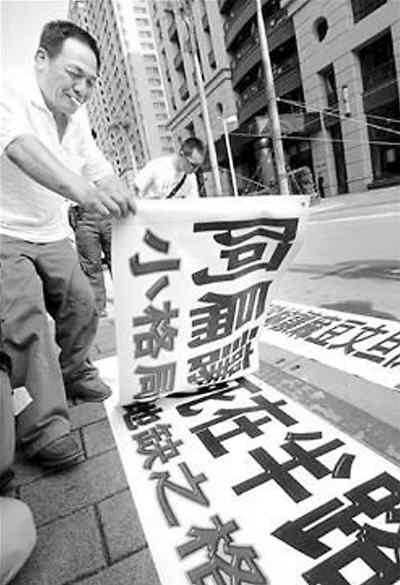 自称吴淑珍老乡的施新登(前),在陈水扁家楼下摆放横幅表示抗议。