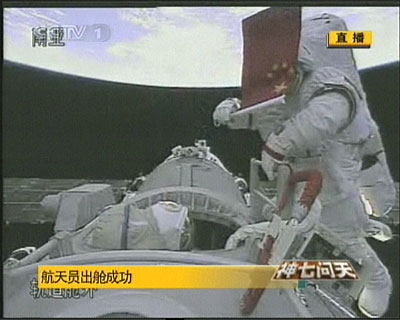 台湾东森新闻报道说,神舟七号航天员翟志刚于下午顺利在太空中迈出第一步。穿着中国研发制造总重120公斤,造价3000万人民币宇宙飞行服的他,以头先脚后的方式进入太空,白色宇宙飞行服上鲜艳的五星红旗显得格外醒目。