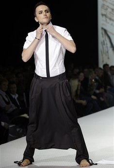 10月24日在莫斯科举行的时装周让人大开眼界,模特们抛开舞台上的矜持,用夸张的步伐、神态和自由的发挥展现另类服装的另类魅力。