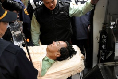 陈水扁躺在担架上,头发凌乱打着点滴。(“中央社”图)