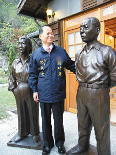 新竹县长郑永金望着少帅铜像,内心无限感动,一旁为赵一荻铜像