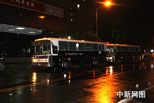 图为3时30分,台北地方法院的警备车载着陈水扁离开台北地院,前往台北看守所后。台北地院恢复平静。保安警察也收工 ,乘车离开。 (中新社记者 陈立宇/摄)
