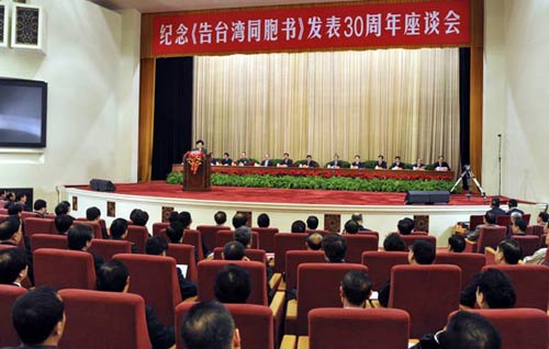 中新网北京12月31日电 纪念《告台湾同胞书》发表30周年座谈会31日上午在人民大会堂隆重举行。中共中央总书记、国家主席、中央军委主席胡锦涛出席座谈会并发表重要讲话。