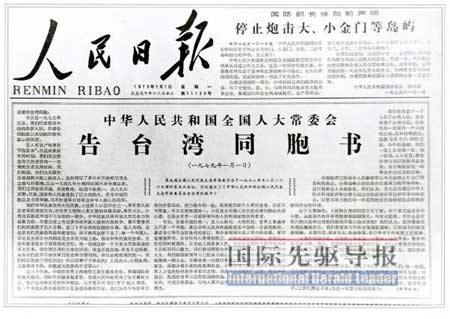 细心的读者发现,在当年的《人民日报》上,这条以“中华人民共和国全国人大常委会”名义发出的《告台湾同胞书》的右上方,还有另一篇配文:“国防部长徐向前声明:停止炮击大、小金门等岛屿”。
