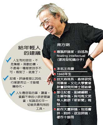 由网友合力写成的维基百科上,是这么说南方朔的:“思想偏左的文化评论家”及“最用功的民间学者”。
