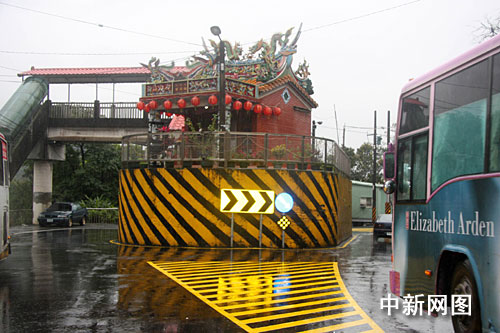 台湾的寺庙成千上万,有建在深山中的,有建在闹市区的,居然还有建在路中间的,有图为证。图为台北县一处交通要道中的寺庙。作 者:陈立宇