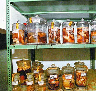 记者通过40米的通道,走到第二栋地势较低的建筑内,记者携带探照灯,穿过一条白墙走道才转弯进入一个房间,抬头赫见整排约50罐尸罐,吓得忍不住后退。原来4排铁架上摆放装有各种器官和尸块的罐子,犹如一座人体器官博物馆,令人全身起鸡皮疙瘩。