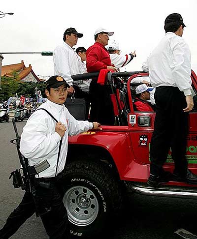 在闻讯陈水扁及吕秀莲遭枪击后,在国民党中央党部前也准备出发扫街的连宋阵营闻讯,立即紧急成立一级戒备,特勤人员荷枪实弹,如临大敌。