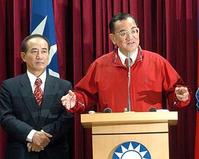 候选人连战(中)傍晚召开记者会宣布所有竞选造势活动暂停,并促当局尽速公布陈水扁遭枪击的细节。