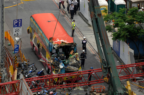中新网4月24日电 据“中央社”报道,台北市信义计划区24日发生起重机吊臂掉落砸中大陆广东旅行团游览车意外,并造成2人死亡多人受伤。