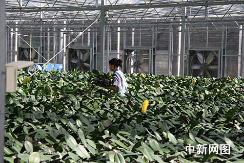 漳州富圣兰花生物科技有限公司内一名员工在园区内修正兰花