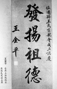 在日前举行的仙游县王氏文化研究会成立大会期间,仙游的王氏宗亲们收到了来自台湾王氏宗亲王金平为王氏宗亲会成立发来的贺呈。王金平的题词是:发扬祖德。(如图)