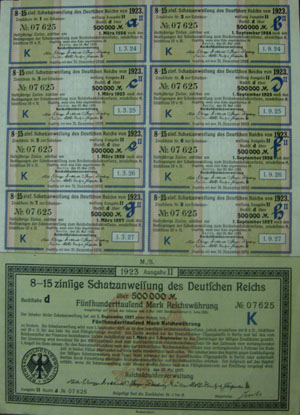 台北市的苏文朗,当年祖父是士林纸厂的干部,他五岁时,曾看过祖父拿出两张钞票大小的“彩色纸片”用来包烟草。当时他好奇地缠着祖父问,这些“图画纸”是哪里来的。祖父抽了一口烟,缓缓地说:“这不是图画纸,是外国钱。”原来祖父当年奉命要以马克债券作为纸厂员工工资,但心软的祖父预感这些“外国钱”兑换无门,因此家境富裕的他,干脆自掏腰包发薪水,而这些马克债券就成了祖父嘴边的彩色烟卷。