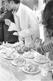 “棺材板,是什么东东,也能吃啊?”“啊,还有传说中的台湾水果啊。”台湾美食的魅力果然不小,尽管下着小雨,不过话音才落,过往的厦大学子纷纷驻足,尝尝这饼,品品那糖,“味道还真不错耶”。