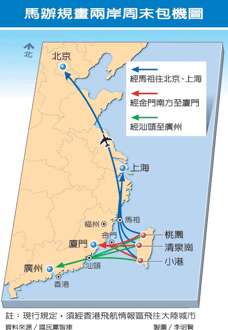 报道称,为加速两岸周末包机进程,马英九昨听取智库永续发展组召集人陈世圯简报,就直航时间、航点等细节交换意见,智库规划两岸飞行航线采“截弯取直”模式,最多可以节省近一半的飞行时间,马当场裁示“积极办理”。