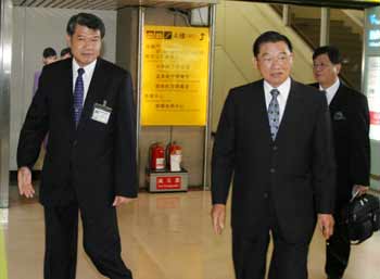 国民党副主席江丙坤 (中)二十四日启程赴大陆展开台商谢票行程,台当局“交通部次长”何暖轩(左)出现在送机行列,两人并在贵宾室交谈二十分钟。“中央社”图