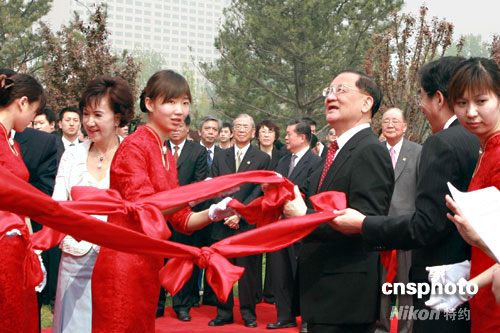 4月29日,中国国民党荣誉主席连战在北京奥林匹克体育中心区为雕塑“水袖”揭幕。廖文静 摄