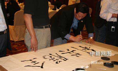 台湾兵法专家傅慰孤亲笔题词“全胜共赢”遥祝两岸和平。汪恩民 摄