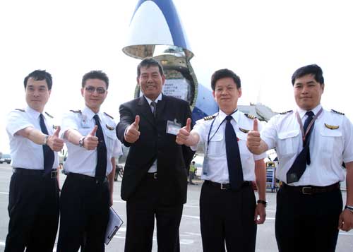 华航五月十五日派出747-400货机直飞成都,成为两岸人道救援包机的首航记录,四名机组人员起飞前比起大拇指。(“中央社”图)
