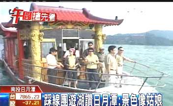 据台湾TVBS报道,大陆踩线团到日月潭观光,当然不会错过搭船游湖这个行程。2艘豪华游艇,早就在湖边等候,等待踩线团成员一上船,直奔邵族祖灵地那鲁岛。