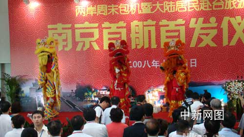 中新网南京7月4日电(记者 丁梅 朱晓颖)伴随喧天的锣鼓声,三只金黄、大红“狮子”跳上舞台。今日早晨七点,两岸周末包机南京首航暨大陆居民赴台旅游首发仪式在南京禄口国际机场隆重举行。