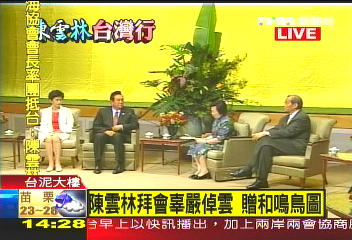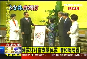 陈云林拜会辜严倬云,追思辜振甫推动两岸关系的精神;辜严倬云首先赠上张大千的名作“和鸣鸟图”给陈云林,象征两岸“合鸣”。