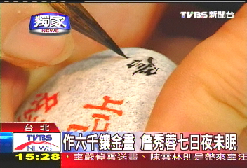 中新网11月4日电 台北“江陈会谈”今天举行,台湾海基会准备了镶有6000金字的“和平协商,共创双赢”的艺术字画,送给陈云林。据台湾TVBS报道,字画创作者、台湾艺术家詹秀蓉透露,为了这幅字画,她不眠不休花了7天时间,才在最后一刻完成。不过,见证两岸历史时刻,詹秀容说,她与有荣焉,所以分文不取。