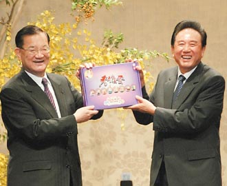 国民党荣誉主席连战(左)4日以晚宴款待海协会会长陈云林(右),并致赠台湾名产“铁蛋”。(图:台湾《联合报》)