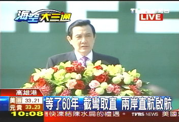 马英九说:“两岸直航所代表的意义,一方面代表两岸的和解,不再走过去对立冲突的路线,也就是说,我们用谈判取代对立,以和解取代冲突,两岸共同谋求和平与繁荣。而从经济面来看,两岸直航,在空运方面可节省大量时间,估计超过30亿元,在海运方面也是一样,每一个航次可节省16到27个小时。”
