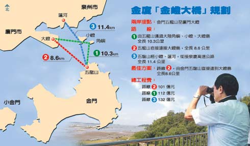 中新网2月5日电 据台湾《联合报》报道,金门与厦门相邻,地方人士一再倡议兴建“金嶝大桥”连接两岸,马英九4日表达强烈关切,询问进度。金门相关人士获悉后相当兴奋,因为完成后从金门可直接开车到厦门,不用再搭船,少花许多时间。