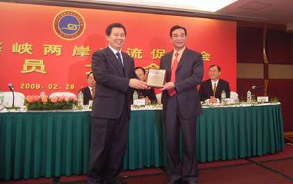 广东省政协副主席陈蔚文(左)为新当选的广东省海峡两岸交流促进会会长陈国兴(右)颁发证书。