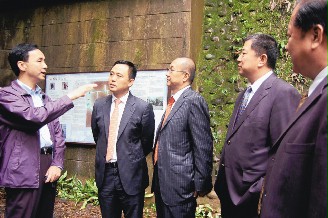 大陆富豪考察团在后慈湖军事隧道前听取解说。