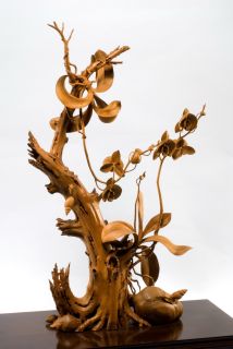 “台湾木艺大展”鹿港木雕大师展出的作品,有神明出访时所乘坐的交通工具“神轿”;还有从牙牙学语的婴儿到调皮捣蛋孩童的“顽童系列”;而木雕的“猪脚”、“鱿鱼”、“鱼”、“猪肉”等山珍海味创作,栩栩如生;并有曾获木雕创作比赛首奖的“生生不息”创作。