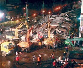屏东恒春近海26日晚发生里氏规模6.7地震,全台皆可感受到震度,8分钟后再发生里氏规模6.4的余震。恒春新兴路1栋3楼的正兴家具行在第2次地震中倒塌,救难人员出动大型机具救人。(来源:台湾《中国时报》)