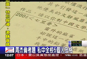 中新网1月26日电 岛内现在的高中考题可谓五花八门,日前台北徐汇中学的高三段考,考题中就出现周杰伦的歌词,其中,周杰伦唱红的歌曲“七里香”等都成为考题,题目像是:周杰伦的歌曲中,营造“夏天”意象来表达对女子的爱情,象征意义为何?这个题目,连作词的方文山都说自己答不出来,最后全班也只有5个人及格。