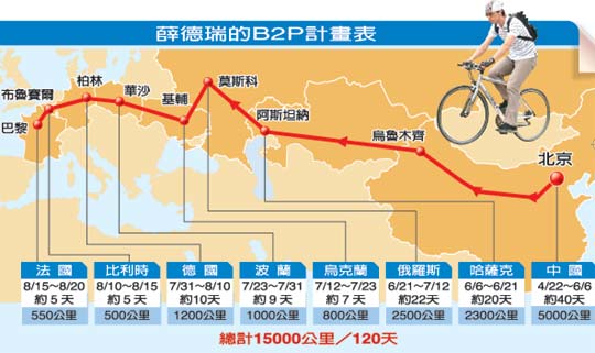 想趁年轻多看看世界,薛德瑞计划3月底离开台积电,原本只是单纯的想“从天安门骑到凯旋门”,后来发现100年前就有人提出“北京到巴黎”计划,决定结合环保意识,以改善地球温室效应为主题,在世界地球日当天展开“B2P”旅行。