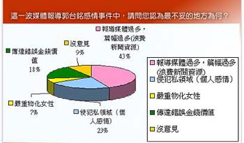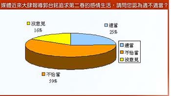 中时电子报为了解一般民众对于此事的看法,于3月14日到16日进行电话访问,结果,当受访者被问到媒体近来如此大篇幅报道郭台铭的感情世界,是否恰当时,竟有59.2%%的人,认为不恰当;认为恰当的比例,仅有24.5%%。而这一波报道中最不妥的地方,有43.4%%的人认为报道篇幅过高,浪费新闻资源;再来为侵犯私领域,赞同比例为22.6%%。此外,并有18.4%%的受访民众,认为传达错误的金钱价值,而认为严重物化女性者也有6.6%。
