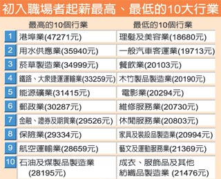 “劳委会”同时公布给初任人员起薪最高、最低的各20个行业,其中最高的前5个行业,分别是“港埠业”4万7271元、“用水供应业”3万5940元、“烟草制造业”3万4999元、“铁路、大众捷运系统运输业”3万3259元、“能源矿业”3万1415元。最低的前5个行业则是“理发及美容业”1万8680元、“一般汽车客运业”1万9713元、“餐饮业”2万0103元、“木竹制品制造业”2万0190元、“电影业”2万0294元。