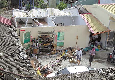 中新网4月19日电 据台湾《中国时报》报道,18日凌晨,威力强大的龙卷风侵袭台南市安南区安南区和台南县安定、善化、大内三乡镇,狂扫四十余分钟,上百处民宅、仓库、猪舍、果园受损,猪被狂风卷到空中跌死,电线杆被吹断,民众心惊胆战度过长夜。(赵家麟)