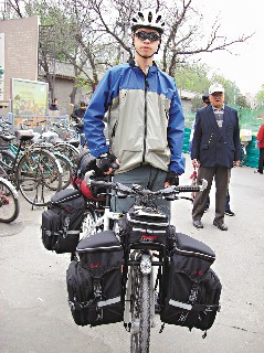 中新网4月24日电 以宣扬减缓地球暖化而骑的台湾青年薛德瑞,昨天(23日)上午9时许从北京天坛出发,展开“B2P”之旅(Beijing to Paris)。他预计以半年时间横跨九国,骑向目标一万五千公里外的法国巴黎。
