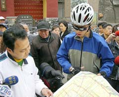 一群在旁围观的北京老太太热情地伸出大拇指,为薛德瑞加油打气,“祝你成功!一路顺风!”一位老太太赞赏,“这种环游世界的雄心壮志挺值得学习!”部分热心的路人则摊开地图,为薛德路指引如何骑出北京城迈上西行之路。
