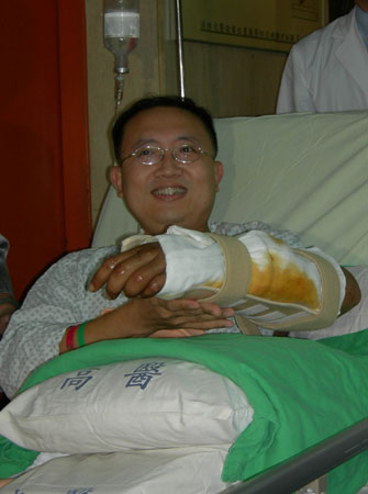 中新网5月28日电 遭鳄鱼咬断左手臂的高雄市寿山动物园组长张博宇,经高雄医学大学附设医院接回断臂并在加护病房观察四十八天,今天转到一般病房。这是全世界首例从鳄鱼嘴中取回断肢又成功接回的案例。